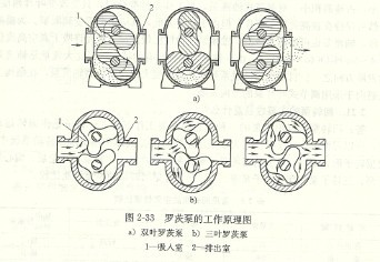 圖2 33為雙葉羅茨泵和三葉羅茨泵的工作原理圖。其原理與齒輪泵相似,當(dāng)轉(zhuǎn)子旋轉(zhuǎn)時將與泵體形成的空間內(nèi)液體沿泵體殼壁從吸入室排送到排出室。當(dāng)軸每轉(zhuǎn)一周,雙葉羅茨泵吸、排各兩次,而三葉羅茨泵吸、排各三次。